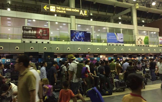 Nhiều hành khách đi Nha Trang bằng chuyến bay của Vietnam Airlines khởi hành lúc 19g đã ra sân bay từ sớm nhưng xếp hàng đợi đến 18g30 vẫn chưa thể làm thủ tục.