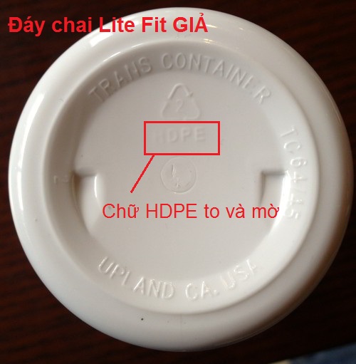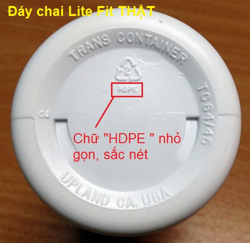 Trong khi đó, đáy chai Lite Fit Giả chữ dập bị mờ, chai Giả nhựa rất bóng. Chữ ” HDPE ” thì mờ và to.